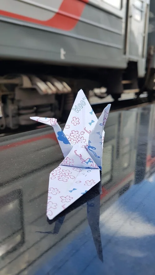 She would tell us how long we had at each stop, 5 minutes or sometimes as long as 30 minutes. You can’t go too far but at each stop I took a picture of one of the cranes I’d made to leave on the platform. At the stations there are small shops selling snacks, drinks and dubious greasy pasties. At one station I had a greasy donut stuffed with cabbage, the good news, it didn’t contain meat, the bad news, it was tasteless.